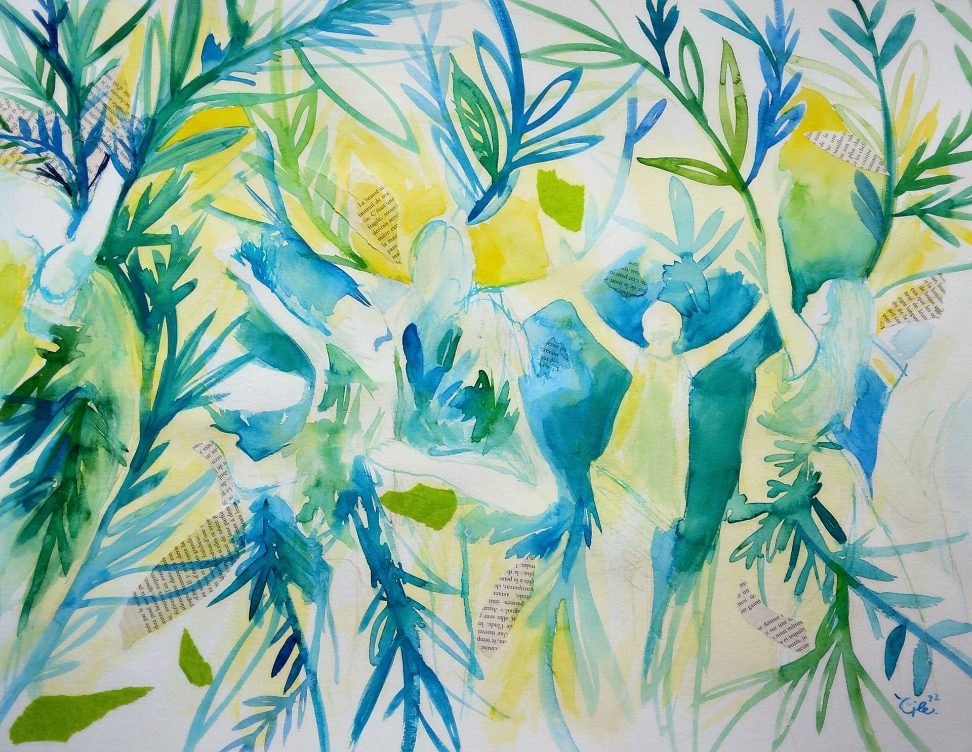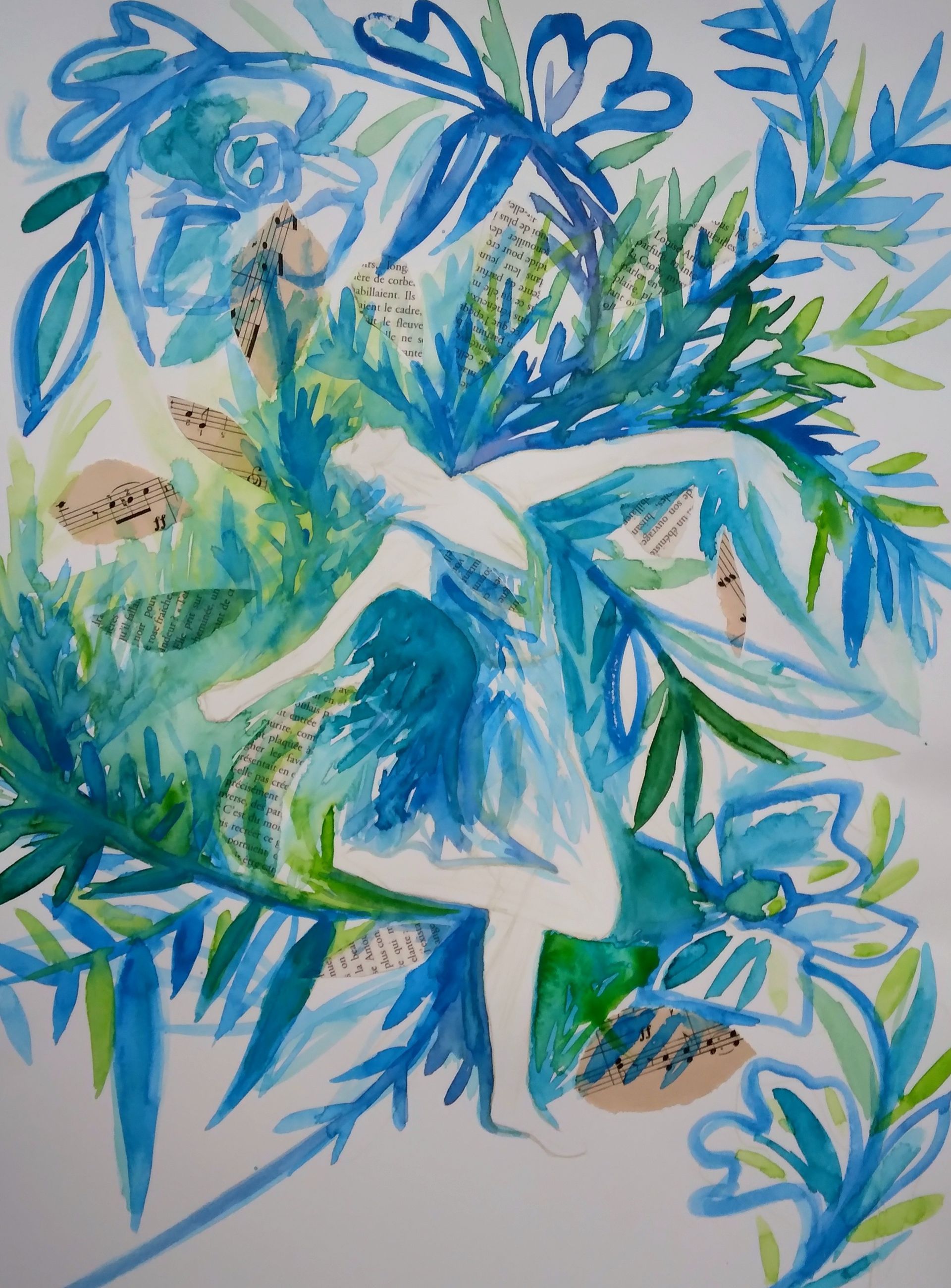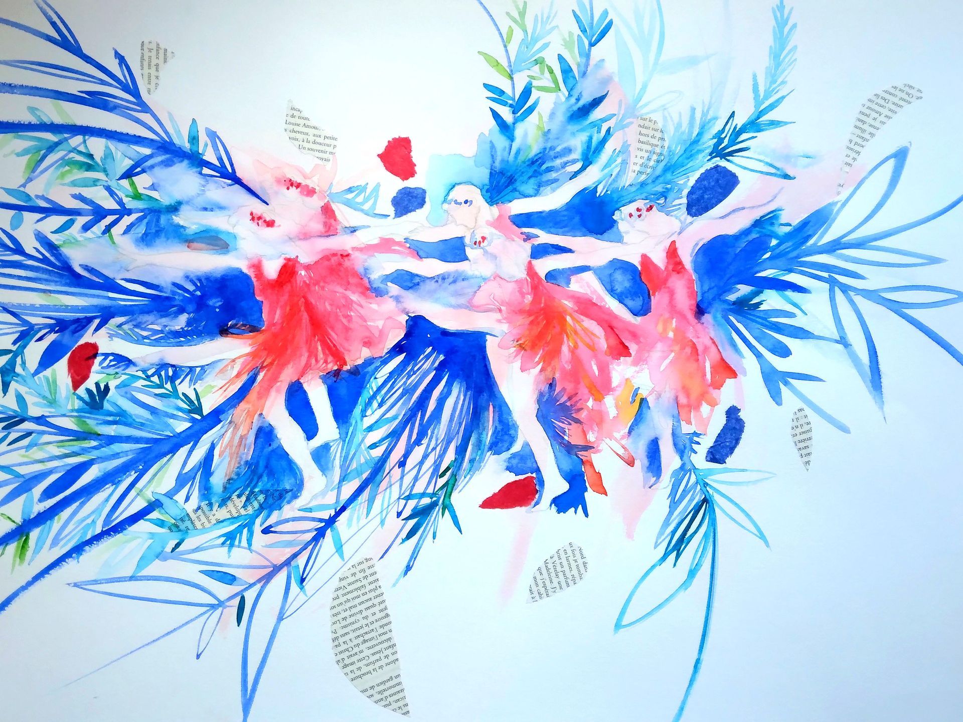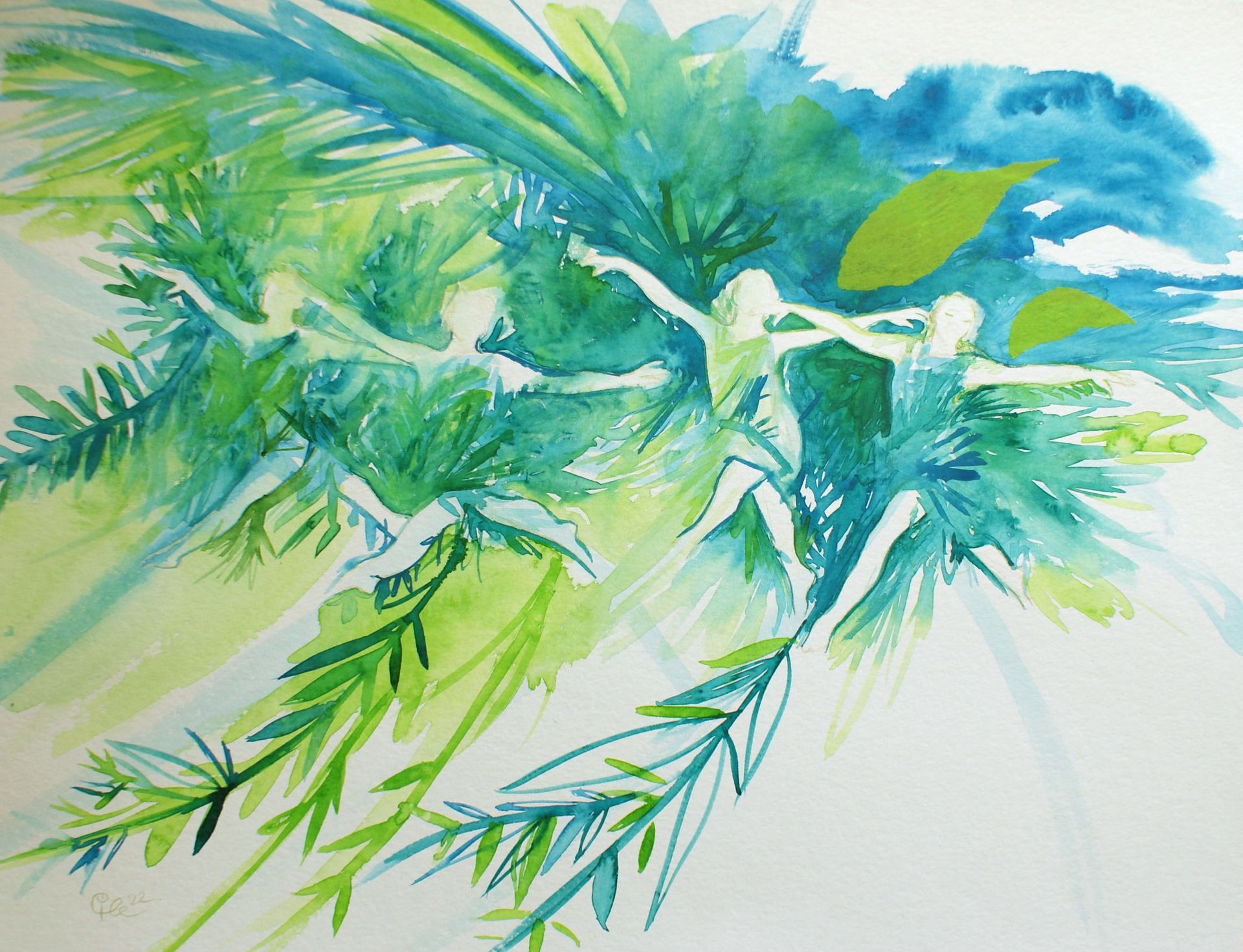 Hommage à Isadora Duncan, cette danseuse du début du XXème siècle qui dansait dans les éléments naturels, en sortant des codes de la danse classique. J’ai souhaité rendre l'énergie de cette danse libre en figurant l’être humain en synergie avec la nature. Les danseuses sont entre ciel, terre et mer. Entre les forêts tropicales, le bleu de l'univers, les profondeurs marines, une atmosphère cosmique reliée à quelque chose de plus grand que nous. Je parle d’azur, de profondeurs, de grands espaces … Ce qui donne envie de vivre c’est cet azur qui nous dépasse, cet inconnu… vers la beauté !