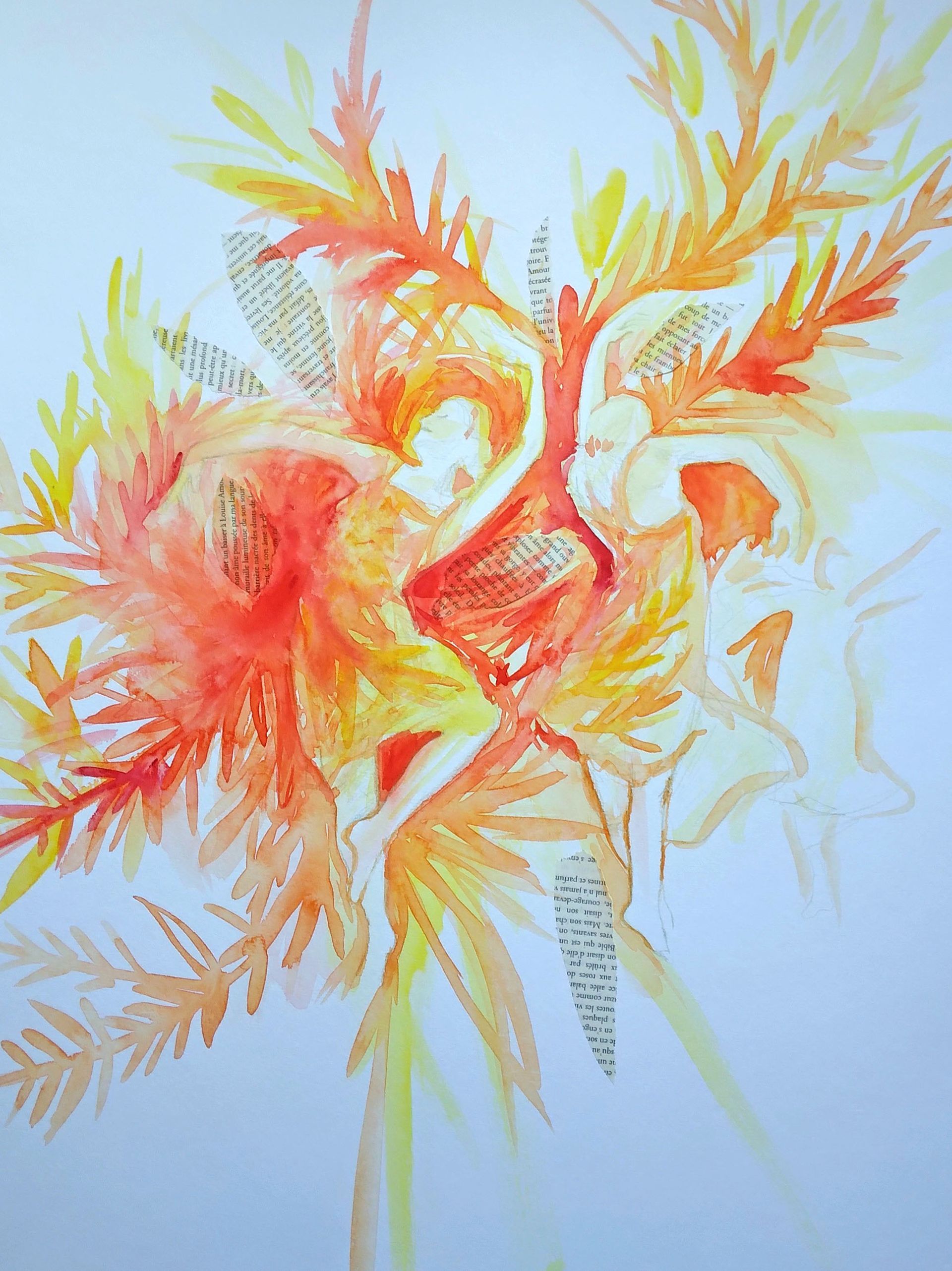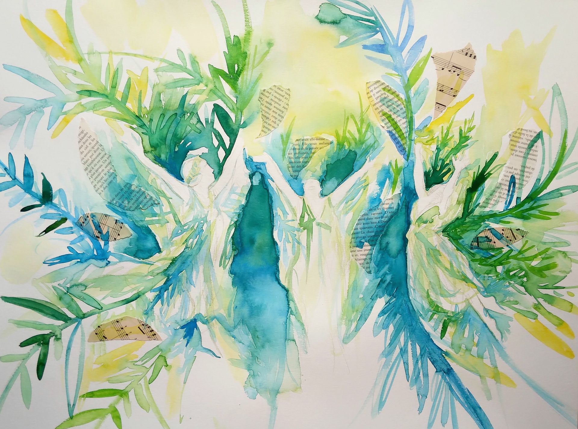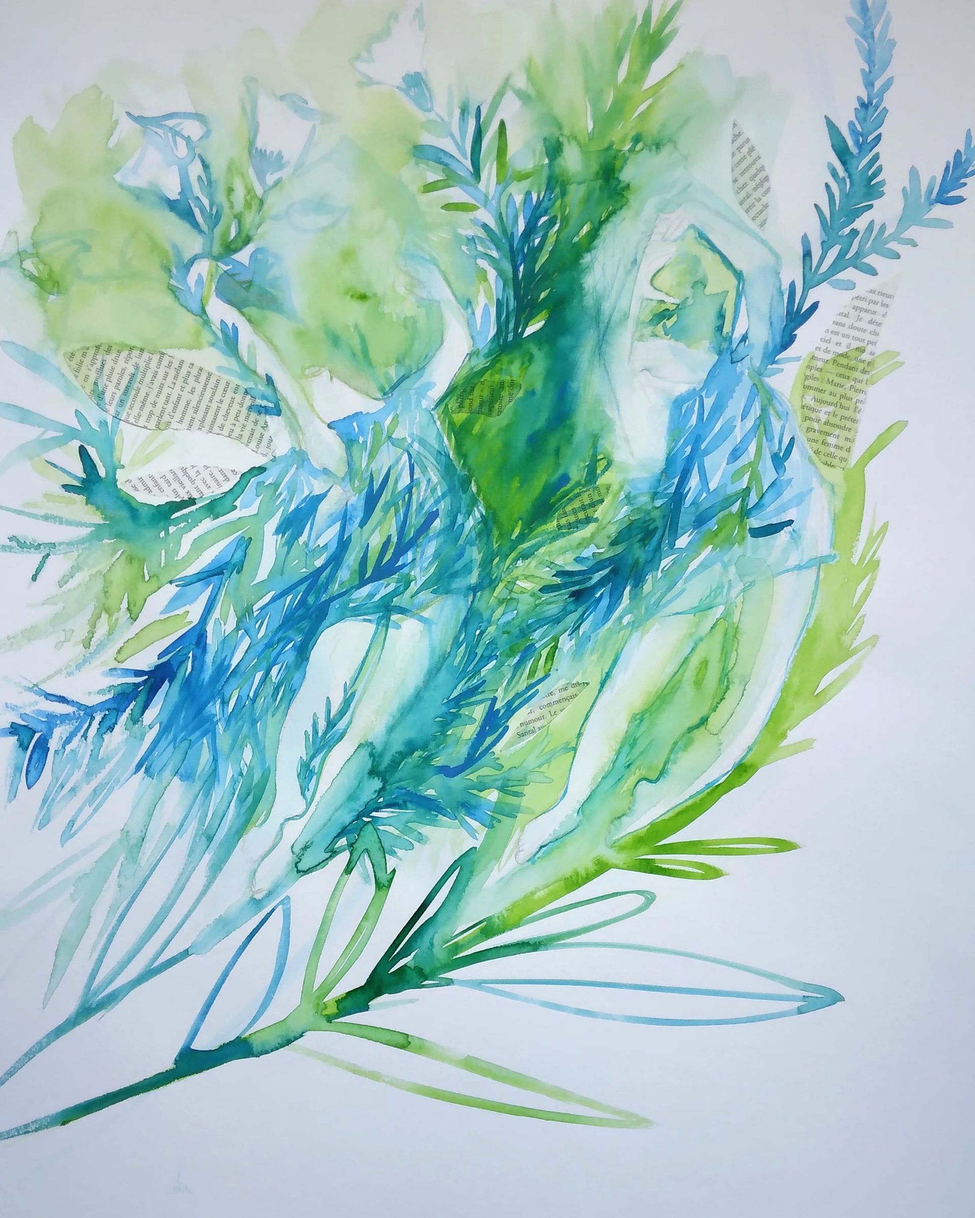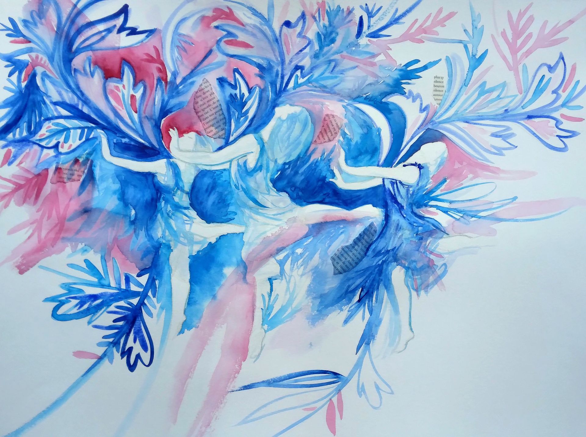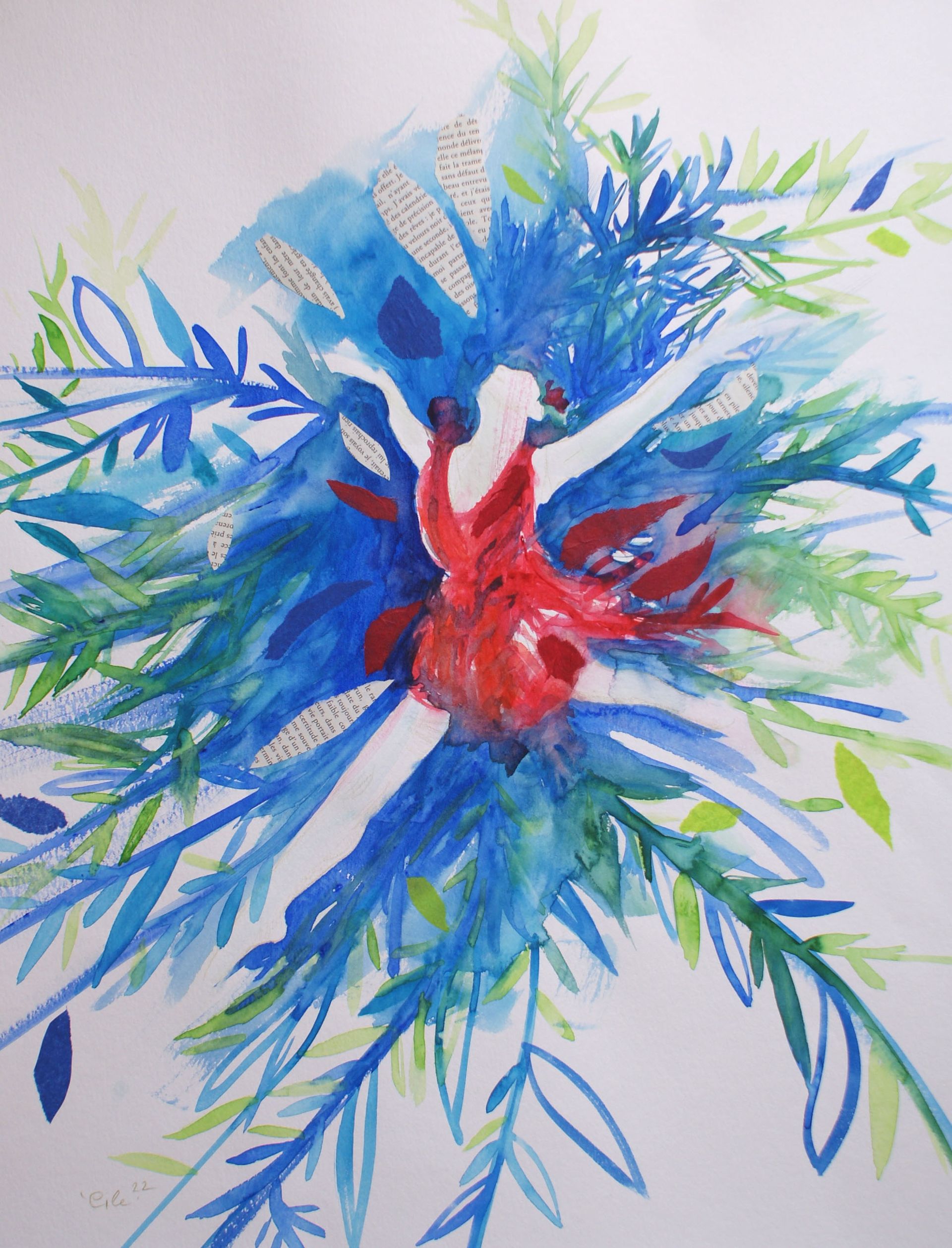 Hommage à Isadora Duncan, cette danseuse du début du XXème siècle qui dansait dans les éléments naturels, en sortant des codes de la danse classique. J’ai souhaité rendre l'énergie de cette danse libre en figurant l’être humain en synergie avec la nature. Les danseuses sont entre ciel, terre et mer. Entre les forêts tropicales, le bleu de l'univers, les profondeurs marines, une atmosphère cosmique reliée à quelque chose de plus grand que nous. Je parle d’azur, de profondeurs, de grands espaces … Ce qui donne envie de vivre c’est cet azur qui nous dépasse, cet inconnu… vers la beauté !