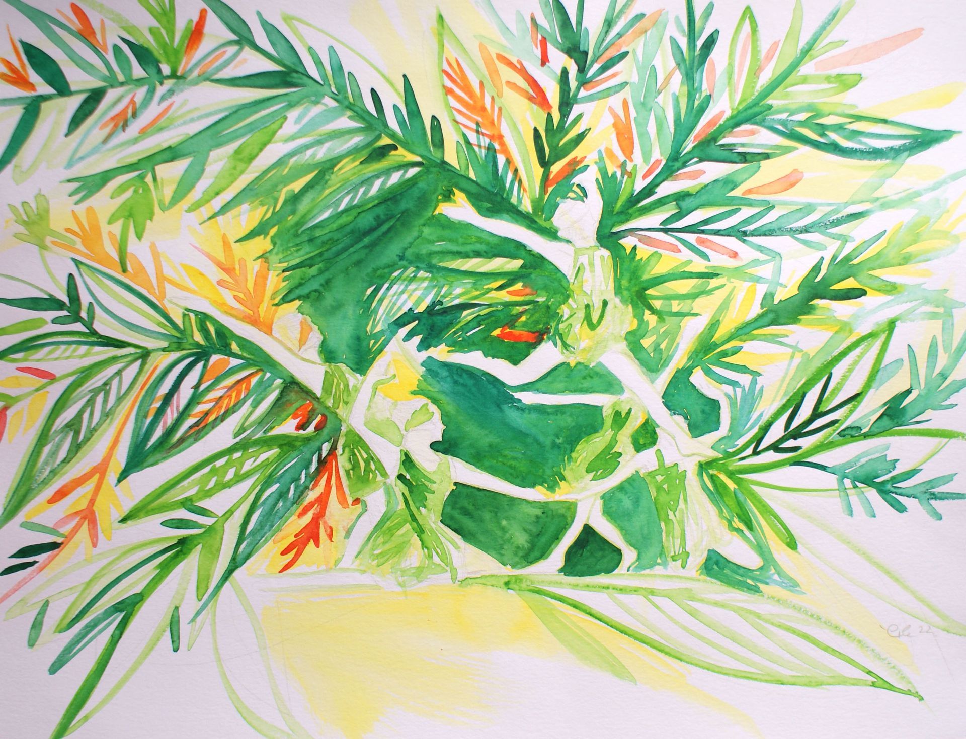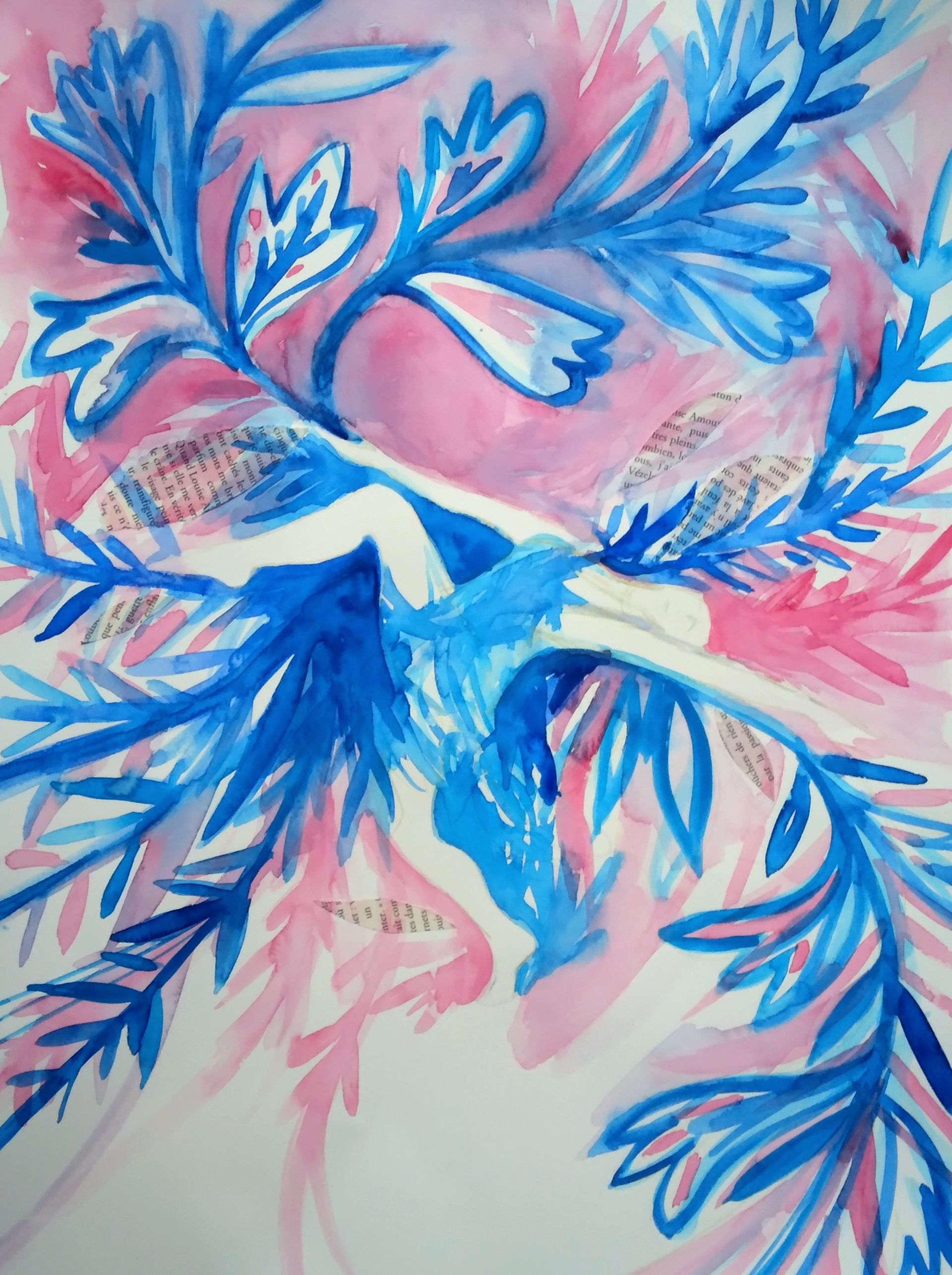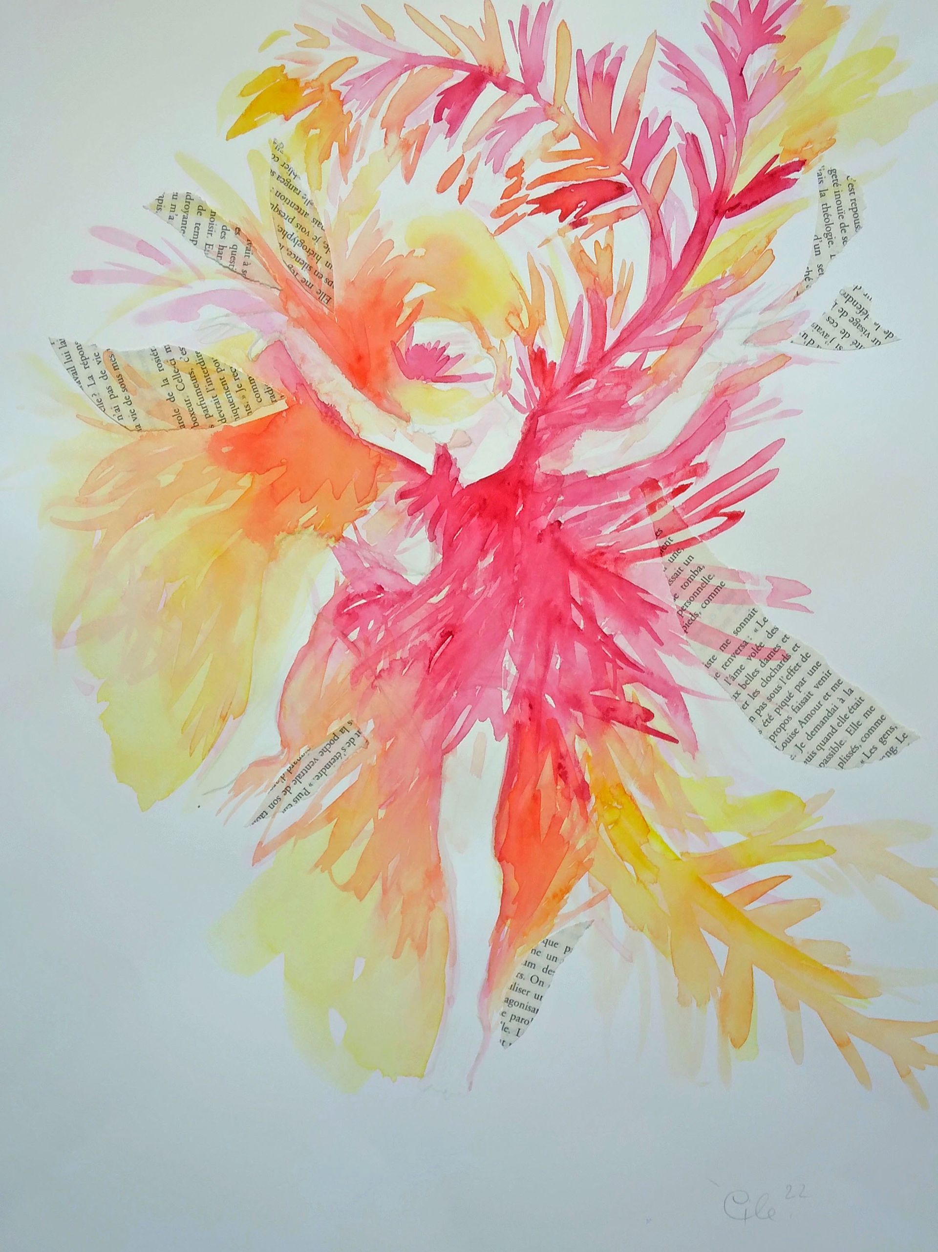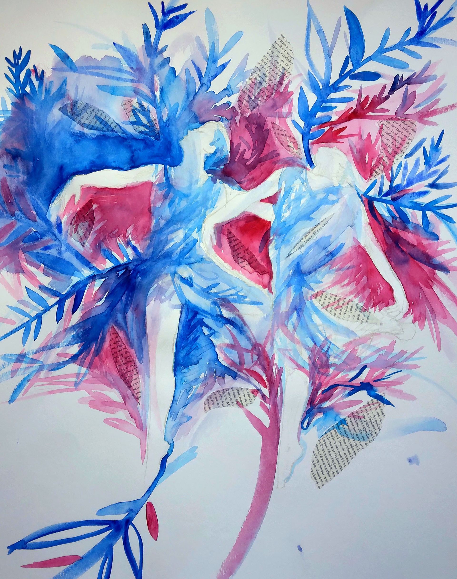 Hommage à Isadora Duncan, cette danseuse du début du XXème siècle qui dansait dans les éléments naturels, en sortant des codes de la danse classique. J’ai souhaité rendre l'énergie de cette danse libre en figurant l’être humain en synergie avec la nature. Les danseuses sont entre ciel, terre et mer. Entre les forêts tropicales, le bleu de l'univers, les profondeurs marines, une atmosphère cosmique reliée à quelque chose de plus grand que nous. Je parle d’azur, de profondeurs, de grands espaces … Ce qui donne envie de vivre c’est cet azur qui nous dépasse, cet inconnu… vers la beauté !